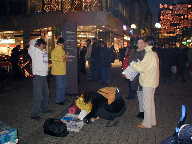 法轮大法洪传世界,哥廷根也不例外,炼功点几年来设在大学的体育馆,每周進行集体炼功。2001年哥廷根市来了好几位年轻的法轮功学员,他们认为尽管人们可以从体育馆的节目单上看到炼功时间和地点,但大部份市民却看不到,作为法轮功学员有责任让民众了解法轮功在中国被迫害的真象。所以他们决定每天下午到市中心炼功。(见明慧报道:《走,到市中心去》 https://www.minghui.org/mh/articles/2001/11/28/20447.html