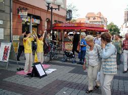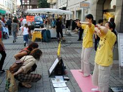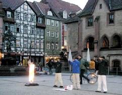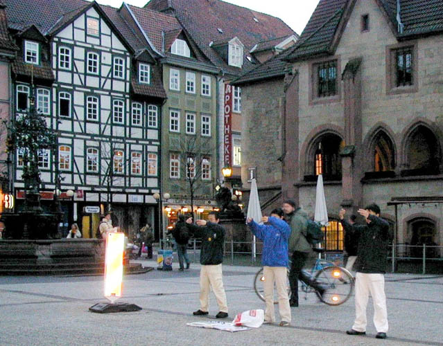 开始这几位法轮功学员曾担心那里不让炼功,只是到比较偏僻的地方炼,后来他们觉得,到户外炼功洪法是为了向哥廷根市民揭露中共对法轮功的邪恶迫害,同时把法轮大法的美好展示给所有人,那么炼功点就应该设在哥廷根的最中心和最热闹的地方。当正视到这一点后,他们堂堂正正走向哥廷根的市中心──旧市政厅广场。有趣的是警察从不过问,尽管广场边上就有警察局。倒是有位警察一次过来询问炼功点在哪儿,说他有时间也会去学。