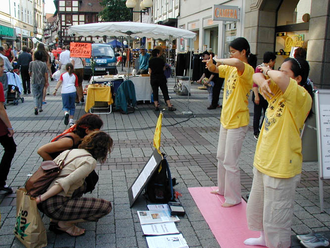 在这一年半中,风雨无阻,每天都有学员在那里炼功,有时三个五个,有时只有一个人,将资料摆在地上,就开始炼功。年轻的中国人展示优美舒缓的法轮功功法、呼吁制止中共迫害法轮功已成为哥廷根旧市政厅广场的一景,不能去炼功的学员就上街征集签名、拜访教授、政治家,走访各个教堂跟神职人员讲真象。随着时间的推移,越来越多的人注意到他们,即使在最糟糕的天气里,也不断有人来问“这是什么?” “中国政府为什么镇压这些和平的炼功者?”“祝你们好运”,等等。再后来,不等法轮功学员去解释,往往路人一开口提问题就会有其他明白真象的人来告诉他真象。