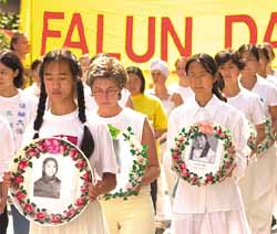 法轮功学员捧着在中国被迫害致死的同修的遗像举行抗议游行