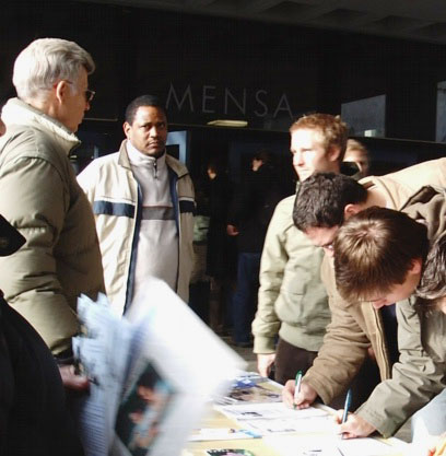 很多大学生听到是为制止人权迫害签名,立即决定贡献自己的力量,还介绍他们的同学都来签名。也有不少大学生看到了展示法轮功学员在中国受到惨无人道的酷刑迫害的画作后,主动签名帮助被迫害人士重获自由。也有大学生受到中共在海外散布的谎言的误导,对法轮功有误解,但是经过讲清真象,表示能够理解。有的静静的站在酷刑图片和说明前面,沉思着。有意思的是,展台前不时传来德国口音的“法轮大法好”。原来大学生们签名后,得到一份小纪念品- 书签或明信片。他们都不约而同的觉得上面的中文字很美,好奇的提问并学着念。