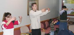 几个法轮功学员分工合作,有的准备音响设备,有的放置介绍法轮大法的展板,有的在外面发放介绍法轮大法的传单。学习班下午2点开始,首先放映了介绍法轮大法的8分钟的录像,然后一边看法轮功创始人李洪志老师的教功录像,一边学习动作。来参加的当地居民虽然不多,但他们都对法轮大法和“真善忍”的原理表现了极大的兴趣,他们学得很认真。