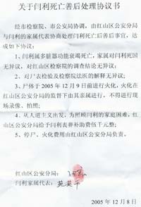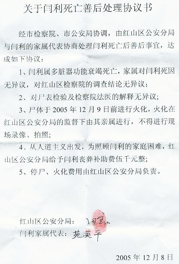 12月8日上午9点半,在红山区看守所,红山公安分局局长、检察院检察长、法医等人草草向闫利的家属宣布了闫利的所谓死因和处理意见,公安局并单方面开出了一份所谓的协议,当场就逼闫利的家属签字。这个被警察称为出于“人道主义”的协议书内容极为无耻、无赖。可见下文下图: