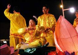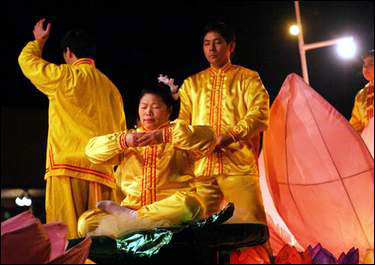 夜幕降临,俄勒冈、华盛顿州法轮功学员们精心制作、装饰的花车在“法轮大法好”的歌声中出发了。身着鲜艳民族服装的女学员翩翩跳起欢快的扇子舞,花车上大小莲花之间学员们不断展示着五套功法,祥和而优美。人们欢呼、拍照,急切的记下这美好的时刻。花车一路走去,“法轮大法好”的嘹亮歌声久久回荡在夜空之中。