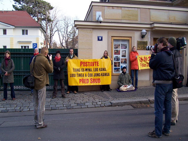 12月8日中午,捷克电视台、“NOVA”和“PRIMA”3家该国最重要的电视台及“今日青年阵线”和“人民报”等报纸及摄影记者,还有捷克广播电台的一位法国编辑在中使馆门前采访了法轮功的抗议活动。