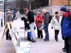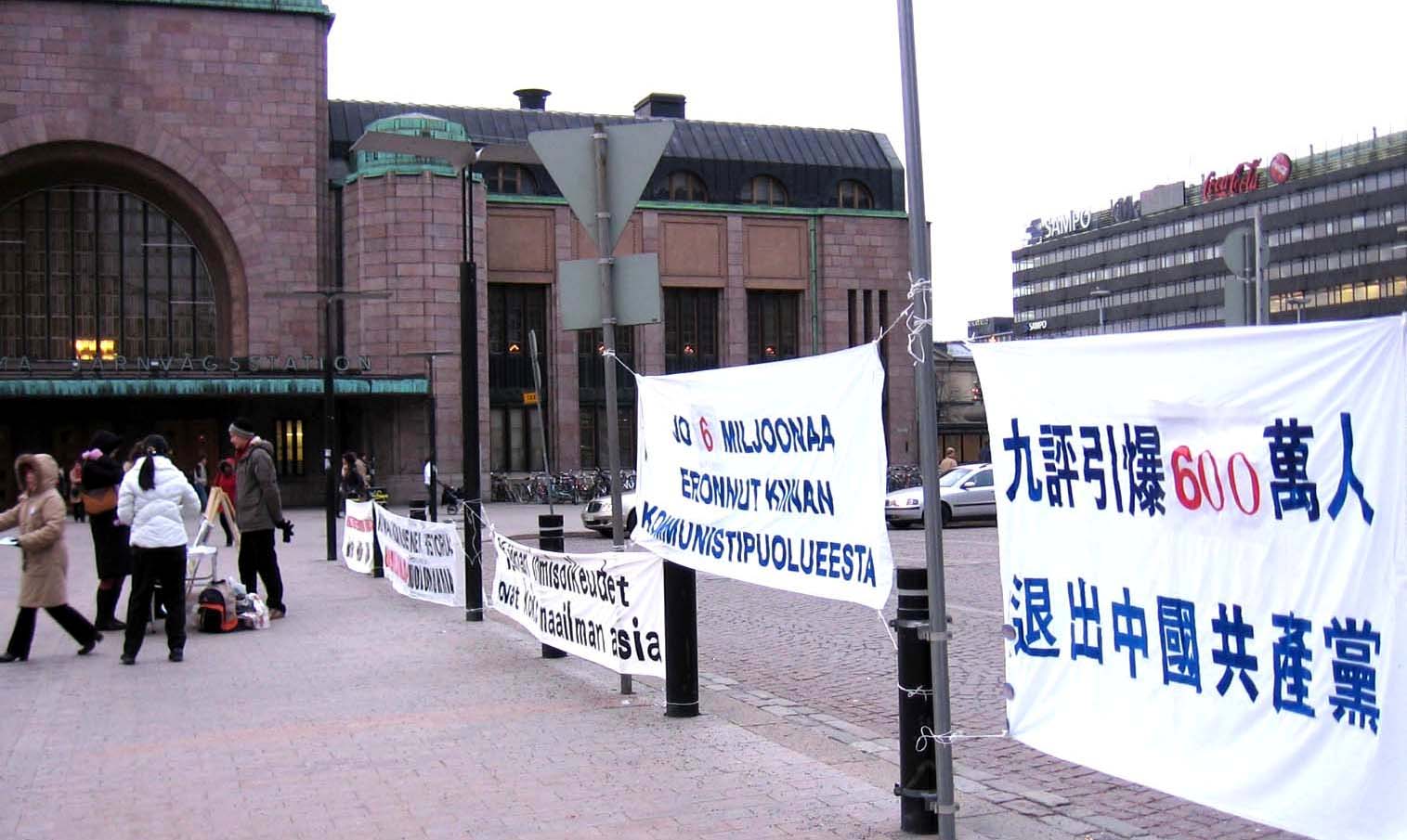 【明慧网2005年12月16日】2005年12月10日,正值世界人权日,芬兰大纪元时报义工在赫尔辛基(Helsinki )火车站旁举办活动声援600万勇士退出中共,揭露中共恶党践踏人权、滥用酷刑的罪恶史实。