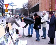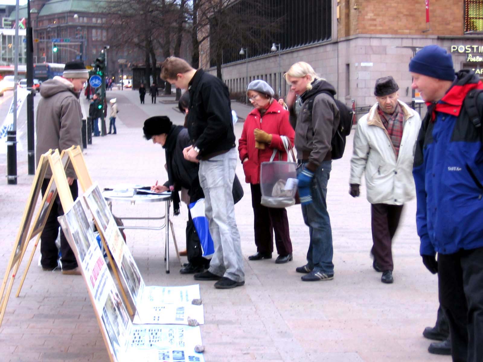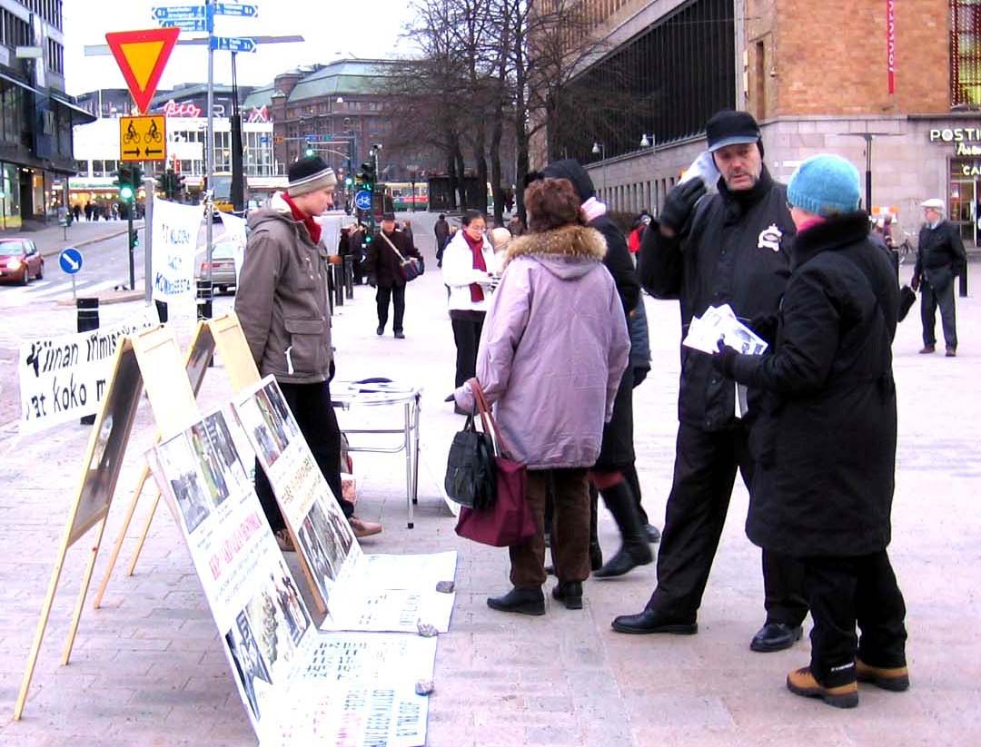 当天是赫尔辛基入冬以来最冷的一天,也是圣诞前夕人们忙于购物的日子,匆忙的人流络绎不绝。但在悬挂着“九评引爆600万人退出中国共产党”的中、芬文横幅前,在中共历史上对中国人民所犯罪行的展板前,在法轮功学员高蓉蓉被电击毁容的照片前,人们放慢了脚步,表情中透露出同情和希望了解这一切的疑问。许多人立即接过资料或找义工询问。