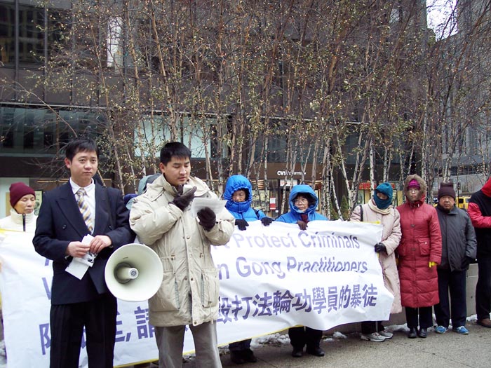 惊闻打人事件后,芝加哥的学员们自发的来到阿根廷领事馆前,在华氏20度低温的寒风中打开了“阿根廷,请严惩殴打法轮功学员的暴徒!”的巨大横幅。学员代表还朗读了一封公开信,公开信中表达了学员们的三点要求:第一,希望阿根廷政府能够调查该起暴力打人事件,严惩打人暴徒;第二,希望调查发出警察对打人事件不予干涉命令的原委;第三,希望不要再发生类似骚扰殴打法轮功学员的事件。