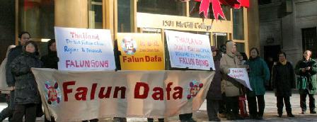 【明慧网2005年12月18日】(明慧记者郑子炎报道)2005年12月15日,蒙特利尔部份法轮功学员冒着零下20多度的严寒,来到泰国驻蒙特利尔领事馆,抗议泰国警方受邪恶中共的驱使,在世界人权日及之后逮捕采取和平方式反对中共迫害的法轮功学员。