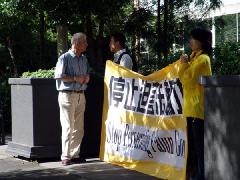 泰国领馆位于繁忙的St. Kilda路上,过往的行人和车辆很多,路过的行人纷纷停下脚步询问事情的原委,并接过学员发放的资料仔细阅读。一位女士了解了真相后表示,作为一个主权国家,在道义和经济利益的选择上表现得如此软弱是一件很悲哀的事。一个民主国家应该坚持自己尊重人权和信仰自由的理念,不应向邪恶势力低头,更不应助纣为虐。