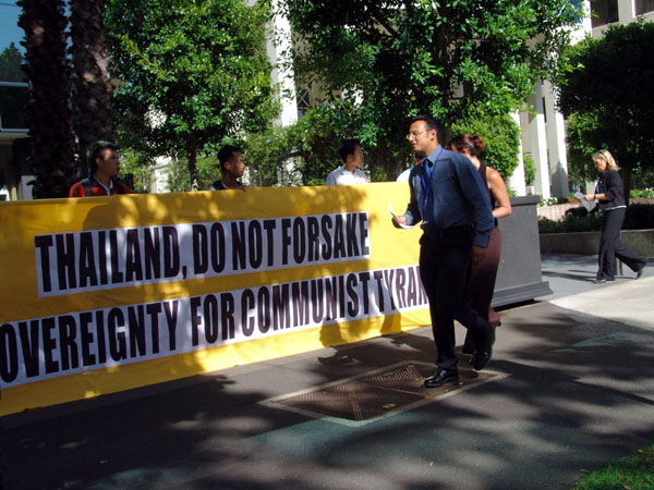 法轮功学员在泰国领馆前讲真相、发正念,他们呼吁泰国政府在共产恶党的邪恶本质和斑斑劣迹已大白于天下的今天,不要再无知的给恶党充当替罪羊,帮助其迫害一群信仰真、善、忍的好人,无论是一个国家还是个人,只有坚持正义和良知才可能有美好的未来。