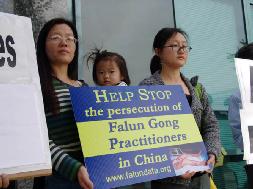 ![]() 法轮功学员在阿根廷领事馆门前打出的标语 |