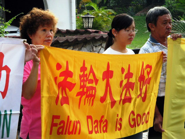 马来西亚法轮功学员在现场举起“阿根廷:不要协同中共迫害法轮功”、“法办江泽民、罗干、周永康、刘京”等横幅,呼吁阿根廷政府不要向中共妥协。
