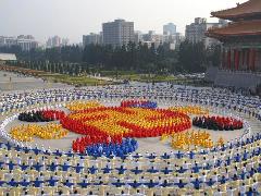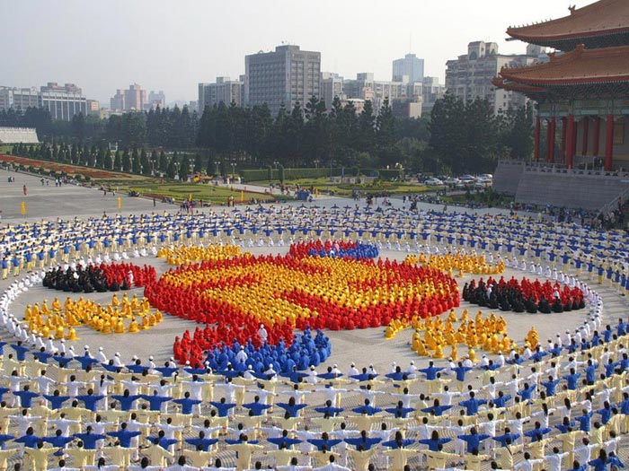 继1998年广州学员排组法轮图形,时隔七年,四千余人排成的法轮图形再现台北,震撼人心。在中共下令镇压法轮功前,大陆各地的集体炼功活动,场面也曾是如此盛大。在中共仍残酷迫害法轮功的今天,台湾学员排出法轮功的标记“法轮图形”,呈现海外各地自由学炼的盛况,也给予大陆法轮功学员积极声援与精神支持。