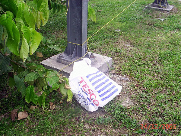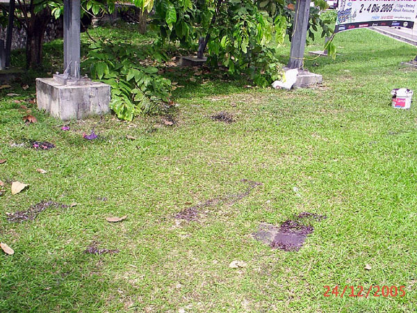 12月24日上午,法轮功学员发现竖立在吉隆坡繁忙的第二中环公路旁的法轮大法广告牌被人用紫色油漆涂污。学员于当天下午2时许到现场拍摄时,发现广告牌下方有一桶剩下一、两寸厚还未干的紫色的漆。同时,在广告牌其中一个铁架下方钩着一个染有紫色漆的“Tesco”塑料袋。在广告牌下方的草地上也染有一些漆。