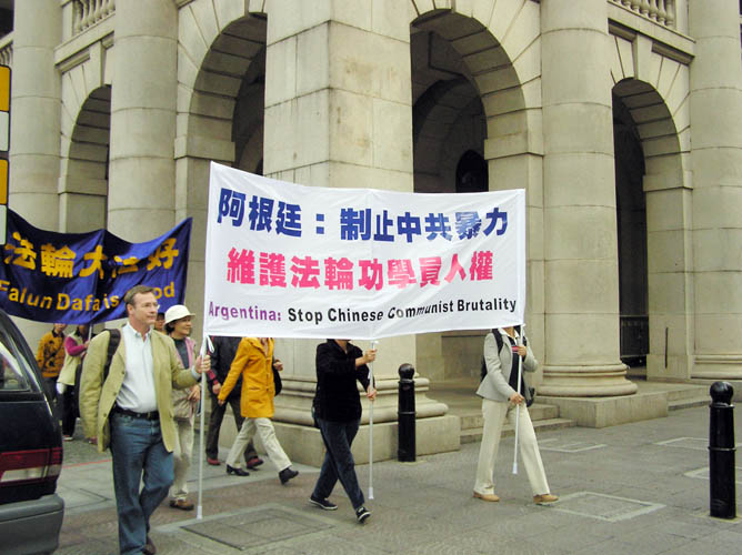 香港法轮功学员,2005年12月29日下午由中环遮打花园游行至阿根廷驻香港总领事馆请愿,针对中共使馆派遣暴徒在阿国向法轮功学员袭击的暴力事件,呼吁阿国政府抵制中共输出暴力,切实保障法轮功学员人权。