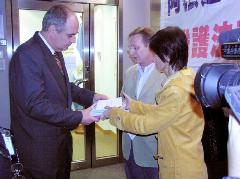 香港学员向阿根廷领馆人员递信