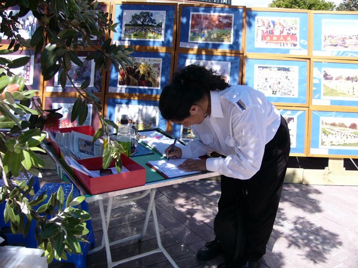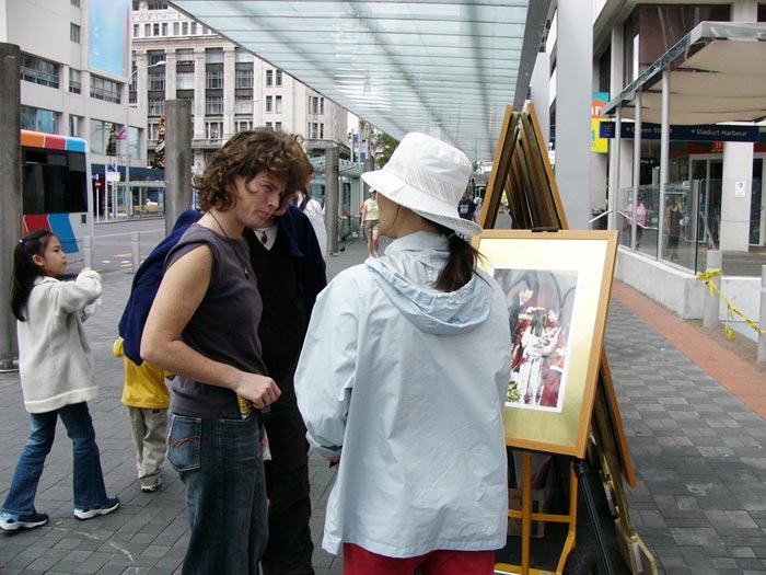 2005年12月4日法轮大法弟子证实法摄影展到了新西兰奥克兰CITY的QUEEN街。两位女青年是从英国来奥克兰旅游的,其中一位说她曾在中国西安工作了6个月,照顾失去父母的孤儿。通过学员讲清真象,她们接下真象资料、签字声援营救受迫害法轮功儿童,表示要通过互联网和告诉佛教徒、基督教徒,把中国还在继续迫害法轮功学员,制造惨案的事实传播出去。让更多的世人知道中共恶党政府迫害法轮功学员的事实,声援早日停止迫害。