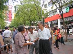 学员们有的发真象资料,有的向民众讲真象,有的炼功,经常是一群人围着看,听真象,然后散了,一会儿,又围上一群人,多时上百人。