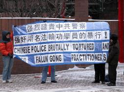 2005年12月5日,在近零下20度的严冬天气,加拿大卡尔加里市的法轮功学员聚集在卡尔加里的中共领馆前抗议中共警察何雪健对两名女法轮功学员的强暴事件,这种光天化日之下的公然强暴行为发生在北京市附近的河北省涿州,令人发指!卡尔加里学员抗议中共恶警暴行中共河北省涿州市东城坊镇派出所的警察何雪健于2005年11月25日下午,在非法审讯法轮功学员韩玉芝和刘季芝的过程中,公开强奸了这两个女学员。