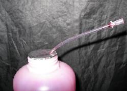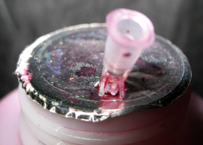 接下来把准备好的输液管或吸管按照墨水瓶的高度剪下。如果是吸管要保证能够套入已割好的前端,然后用AB胶在塑料接头前部管口处涂胶,再把剪好的管子一头插入即可。待胶干后插入墨水瓶,墨瓶金属封口开口不要太大刚好容下胶管即可。如图所示。用时,只要把注射器插入塑料接口即可抽墨,抽出墨后从接头处拔下即可注墨。不用再把墨瓶倾斜抽墨了,原理也是效仿现在常见的喷壶原理,但要注意软管尽量选择较硬的,以防在瓶内打弯时,当墨水接近瓶底时不容易吸墨!还有不用时,用塑料袋把瓶口罩上防止灰尘,仅供大家参考!如果有更好的方法也希望大家交流!