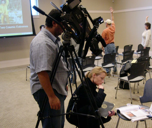 电视台的记者们在图书馆门口遇到了在发介绍法轮功传单的学员,于是他们就架起了摄像机,开始采访。记者问了很多问题,这位美国学员一一作了解答。