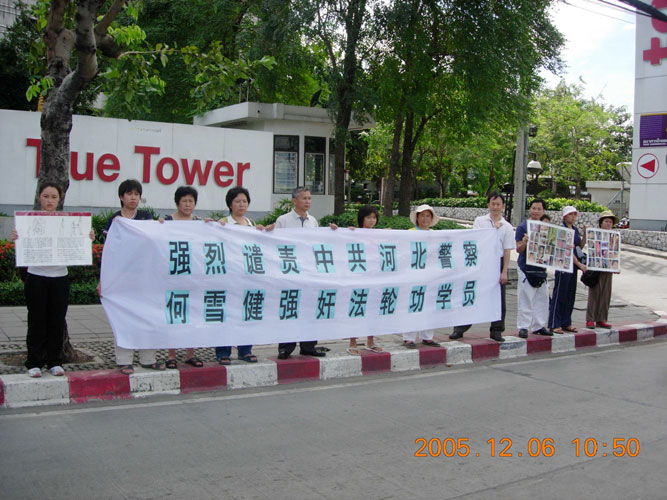 泰国法轮功学员在此表示强烈抗议,并呼吁国际社会帮助制止仍在中国发生的残酷迫害,严惩强奸犯何雪健及各级责任人,法办迫害法轮功的主犯江泽民、罗干、刘京、周永康。
