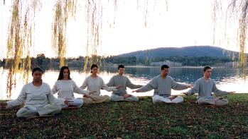 这张照片记录的是大法弟子清晨炼功。软软的垂柳轻轻拂着他们的肩头,清澈的空气衬托着炼功人祥和的静坐。