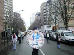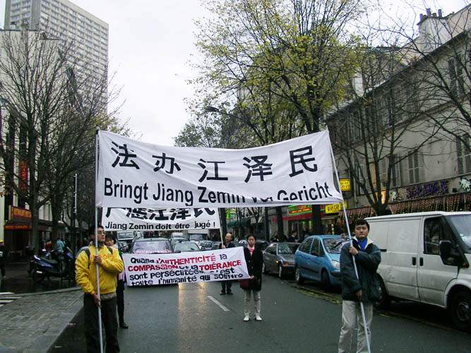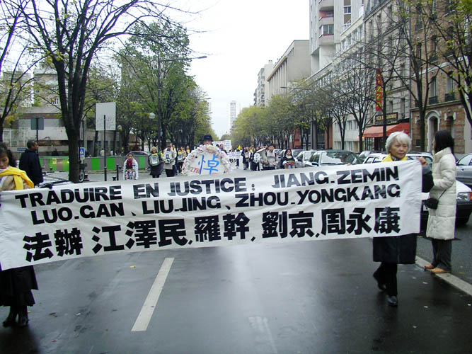 4日下午,在巴黎华人聚居的13区,举行了大型游行活动。游行中,法轮功学员打出了“法轮大法好”、“法办江泽民、罗干、刘京、周永康”的横幅;同时,还沿途用中、法文宣读了《法轮大法学会公告》,并要求温家宝制止对法轮功的迫害,严惩迫害元凶。