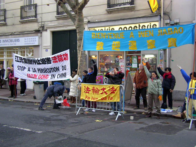 5日下午,在中共驻法国领事馆前,法轮功学员举行了抗议活动:要求停止迫害,法办江泽民、罗干、刘京、周永康等人。当学员打出“欢迎温家宝”等横幅时,中领馆里的工作人员好奇的在窗口探头张望,还招呼同伴来观看,并议论纷纷,有的甚至走出领馆,笑容满面的跟学员打招呼、索要真象资料。