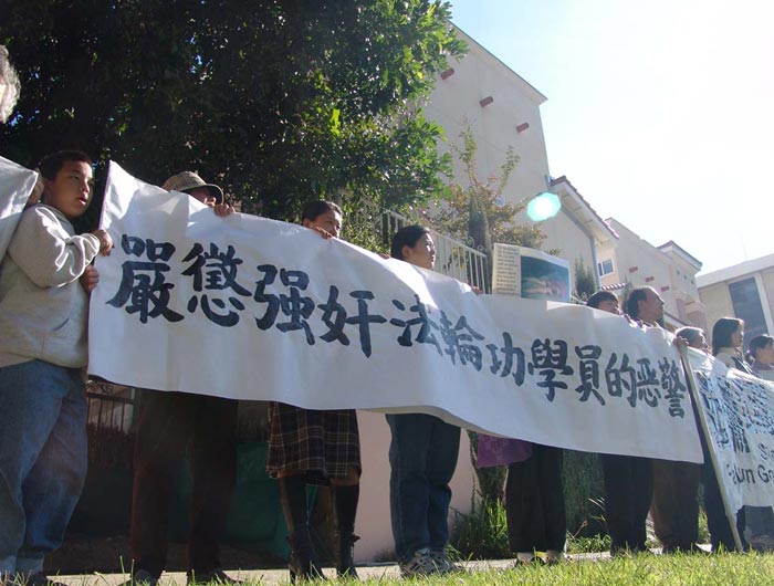 法轮功学员还指出,法轮功在大陆遭野蛮迫害已逾六年,造成至少2790人被迫害致死,其中妇女高达54.7%。在肆无忌惮的迫害政策下,恶警强奸、轮奸、性虐待女性法轮功学员的案件屡屡发生。这些发生在21世纪的今天的恶性案件,受害的不仅仅是法轮功学员,而且也侮辱了全中国的民众,践踏了全人类的基本道德良知。法轮功学员呼吁中领馆及中共内部良知尚存的官员,立即停止追随迫害政策,不要再和残害无辜百姓的豺狼为伍。