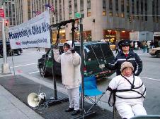 2005年2月9日是中国农历的新年。在全球华人都合家欢度新年的时刻,来自世界各国的部分法轮功学员,仍然一如既往的坚持在曼哈顿向世人讲清法轮功真象。酷刑展示真象展板讲真象经常有人驻足签