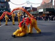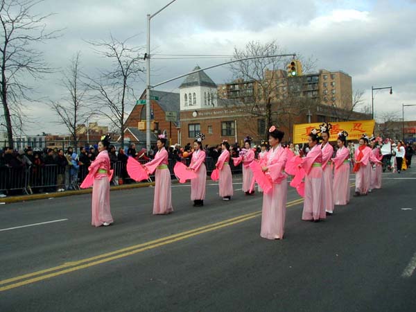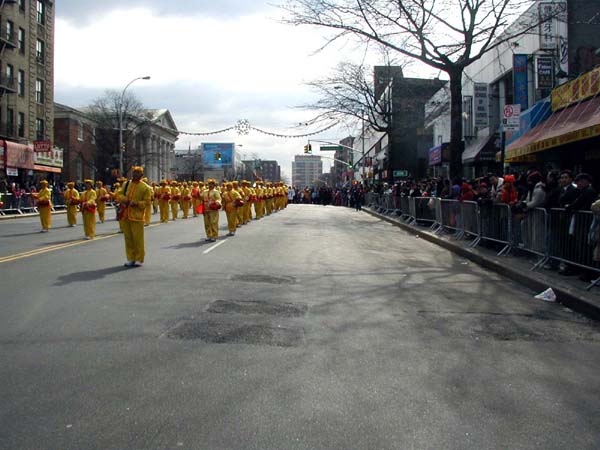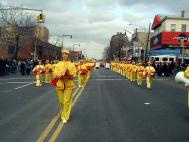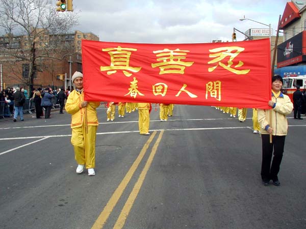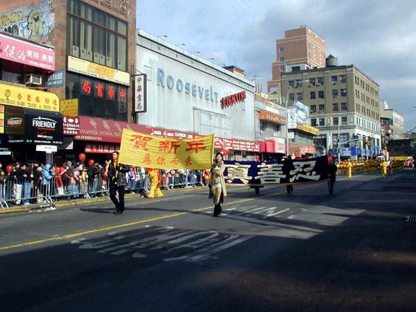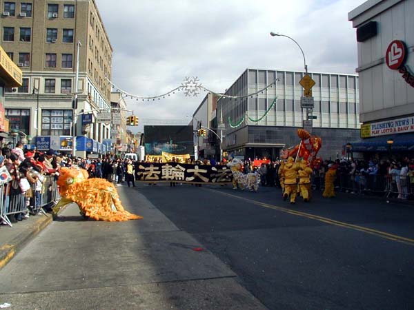 1999年7月中共江氏集团在大陆开始迫害法轮功,并以在纽约的领馆为大本营,把魔爪伸向了各个华人社区,以亲共社团为喉舌,百般阻挠法轮功学员参加社区的各项活动,特别中国城、法拉盛的新年游行。法轮功学员持之以恒,坚持向社区的各界人士全面讲清真象,进行法律咨询,及时和媒体沟通,揭露中共在美国的国土里践踏信仰自由。法轮功学员最终都参加了2000、2001、2002、2003年的法拉盛新年游行。2004年起法拉盛社区全面接受法轮功学员的游行队伍,并且法轮功学员的游行队伍赢得了内容丰富,多姿多彩,很有看头的好名声。