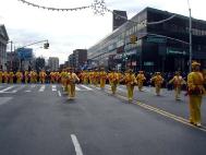 法轮功学员气势磅礴的横幅、气贯长虹的金龙、生龙活虎的狮子、雄姿飒爽的腰鼓队、还有翩翩起舞的仙女、法轮功学员方阵,浩浩荡荡,博得了阵阵掌声,是整个游行队伍中最引人注目的一支。
