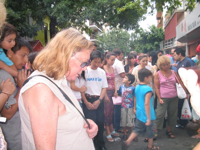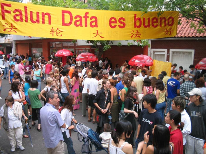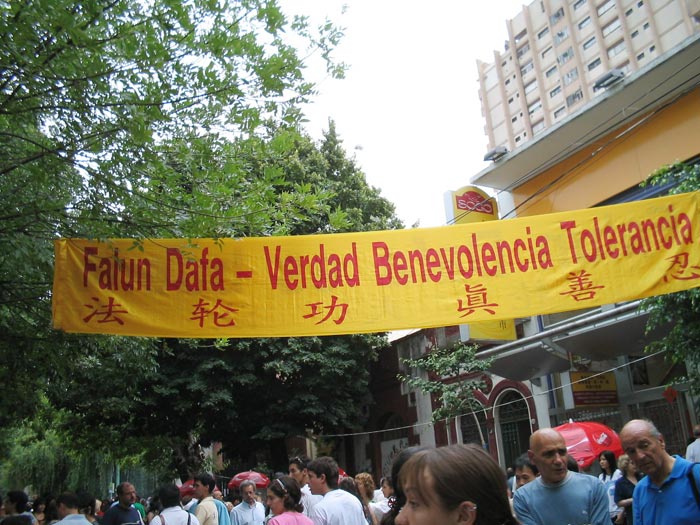 【明慧网2005年2月22日】每年的旧历新年,阿根廷首都布宜诺斯艾利斯(Buenos Aires)的中国城都会举行园游会。法轮功学员已三次参加该活动。第一次申请参加时,主办单位不太了解法轮功,可是法轮功学员表现得特别好,又受到民众的欢迎,主办单位很高兴。第二年特别的准许学员们把法轮大法横幅横街挂上。今年法轮功学员申请参加时,主办单位特别表示:横幅可以像去年一样横街挂,并且还可以把梯子借给学员使用。园游会那天,主办单位看法轮功学员展位前面挤着最多的人,特意两次过来询问是否还需要他们的帮助。