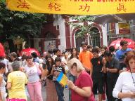 还有一些华人,看到法轮功学员们,很想看真象,可是受到中共那么多年高压统治的影响而产生的自保习惯又使他们不敢过来看,远远的站在人群中向这边观望。学员过去给他们发资料并告诉他们说:资料看完,请传给朋友看。有一个年轻的中国大陆人小声的说:“前几天我拿到一份九评(共产党),我看完了,我可以借给朋友看,可是我才不给别人呢,这很宝贵的,我要留着给我自己!”