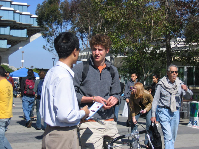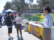 加州大学圣地亚哥分校法轮大法俱乐部是2004年初成立的。成立以来,俱乐部在学校中心的图书馆前举办了近十次法轮大法信息咨询活动,主持了多次法轮大法免费教功班,并参加了2004年春天的“太阳神”节庆。俱乐部成员在“太阳神”节上的讲真象活动吸引了大量师生的注意,学校校报“卫报”还正面报道了俱乐部的活动。