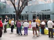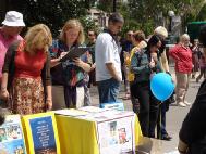 一位华人母亲带了一对十几岁的儿女来到画展。她告诉学员们,在路上她的儿子接到了画展的传单,问妈妈什么是法轮功,为什么有迫害,并且非要来画展一探究竟。妈妈知道倔不过儿子就只好一起来了。她进门时还对儿子说,看就看了,不要太相信。经过学员对作品的讲解,对修炼、迫害等问题的解疑,这位妈妈渐渐对法轮大法产生了正念。她对学员说,以前看到报纸上报导法轮功她就跳过不看, 今天还是儿子的坚持让她得以从画展中了解法轮功。她把儿女都叫来认识法轮功学员,临走时高高兴兴的带上了真象材料,让孩子回家阅读。