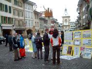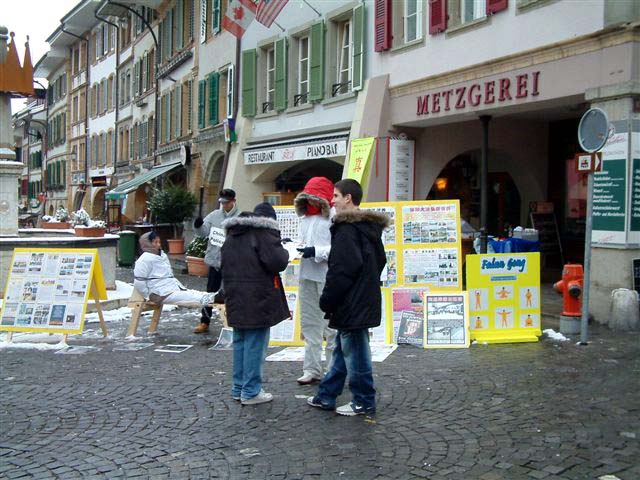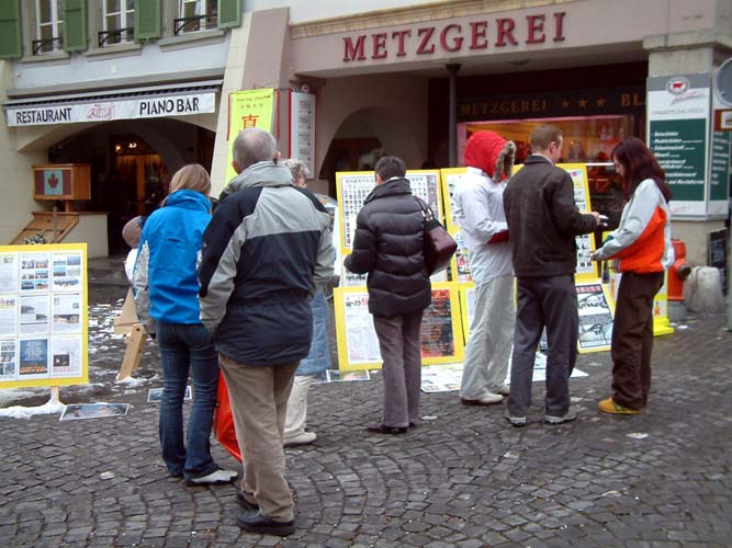 【明慧网2005年2月23日】虽然已是2月中旬,瑞士西部依然白雪绵绵,寒风凛凛。2005年2月19日,瑞士德语区部分法轮功学员冒着严寒,分别在穆尔登(Murten)、施维兹(Schwyz)举办反酷刑展以揭露中共江氏集团对法轮功的残酷迫害。面对真象展板和真人模拟的反酷刑展,人们震惊了!他们对中共江氏政治流氓集团如此丧心病狂的迫害善良民众,使得中国人民这么没有信仰自由、没有人权,表示极大的愤慨,对中国大陆法轮功学员的遭遇表示了极大的同情。人们主动索拿真象材料,听学员的介绍,并纷纷签名支持法轮功。