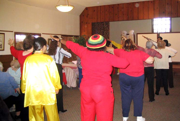 例会的最后一项内容是请学员们介绍法轮功。学员们先放了一个介绍法轮功的短片,然后表演了功法。到会的会员们一边听着悠扬的音乐,一边神情专注的看着学员们优美的功法表演。最后多数人都表示要学功。于是学员们教了全部五套功法。该会现任会长说她一边炼,一边听见自己的骨节喀喀作响,感觉很好。很多人都表示感受到很强的能量在体内流动。当时就有数人留下联络信息,表示愿意一起炼功。学员们回答了她们的问题,并表示如果需要,会再来办免费教功班。
