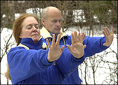 一位60多岁的妇女要求马上学功。一位学员正准备教她时,她对站在旁边的一位男士说:“你来跟我一起学。”那位男士就和她一起学起了前四套功法。学员一直以为他们是一对夫妇。结果在学员给这位妇女写联系地址,那位先生先走了时,这位学员才知道原来他们也是在这儿萍水相逢。