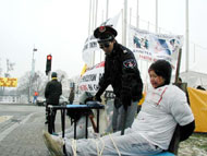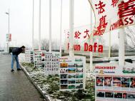![]() 讲真象 | ![]() 揭露迫害的展板帮助人们了解真象 | ![]() 法轮功学员的活动地点车展主路一侧的小公园 |