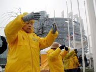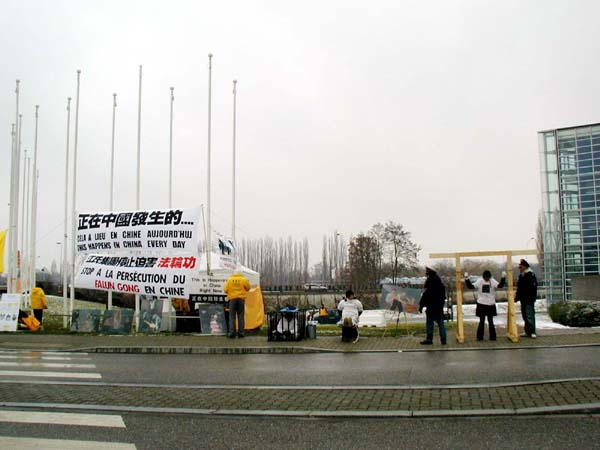参加这次活动的法轮功学员分别来自法国、瑞士、德国和丹麦。尽管天气异常寒冷,大风不断夹着雪花袭来,另一请愿的团体上午很早的时候就离开了广场,但法轮功学员不为所动,坚持在大厦前進行请愿活动。来自巴黎的学员夜里1点钟就出发了,早上8点才抵达,他们中很多人年纪已经很大了,但他们举横幅、发资料、炼功样样不落。