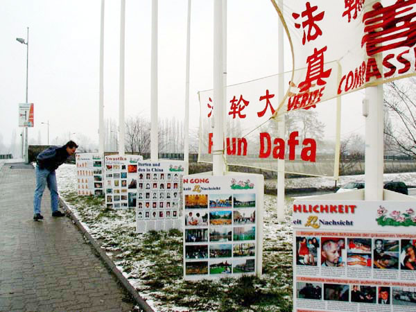 在真人模拟酷刑展示的旁边,中、英、法、德文的大幅标语提醒人们这是正在中国发生的事情;真象图片则展示出大法洪传世界和中共对法轮功的迫害;在“法轮大法好”的横幅下是安静的炼功的学员。这一切吸引了人们的目光,过往的车辆早早的打开车窗,索取真象资料,不少来欧盟参观的人们停在展台前和学员交谈,仔细观看酷刑表演和展板。一队放学路过的学生,几乎是争先恐后的伸手向学员要资料。一位穿着非常考究的男士从欧盟大厦出来,拉着扮演受酷刑学员的手,非得往她手中塞钱,学员向他道谢并告诉他,钱不能收,他的心意领了,希望他能在道义上多支持法轮功。