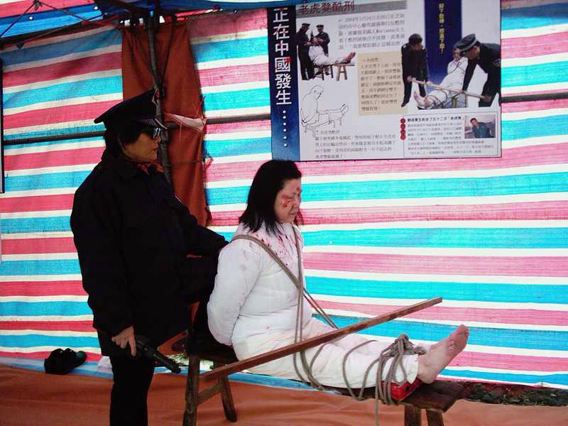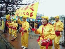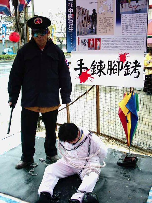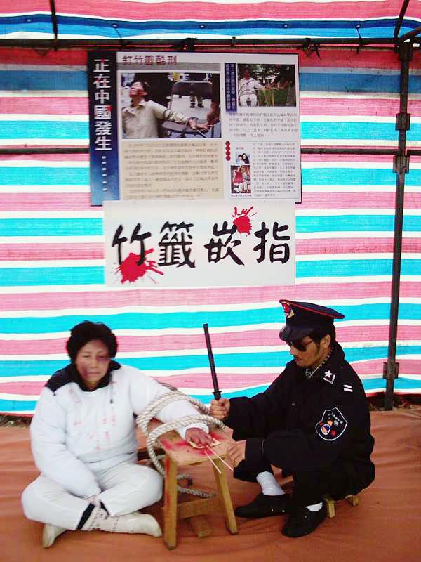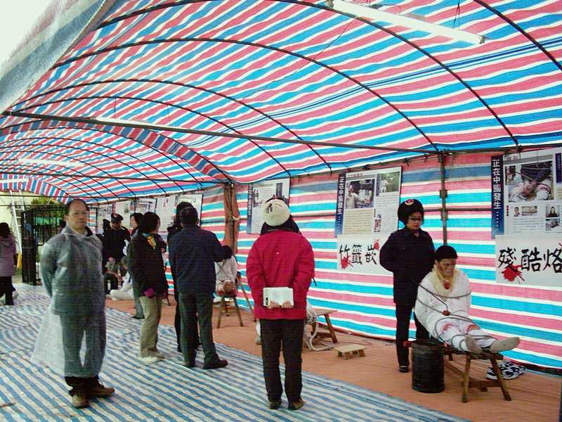 更奇特的是,从台中县市、彰化、南投、云林等等各地来的法轮功学员,不畏摄氏10度以下的寒风骤雨,齐聚一堂学法、炼功、洪法、讲真象、办“反酷刑展”,揭露了中共江氏集团为迫使法轮功学员放弃对“真善忍”的信仰而采取的种种酷刑:捆刑、竹签插指、手镣脚铐、吊刑、坐老虎凳、强迫灌食、电棍电击、罚做超时奴工……其实这些只是冰山一角,比起法轮功学员在大陆所遭受的肉体及精神上的折磨,还不及万分之一!