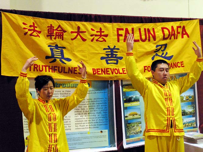 在二零零五年二月十九日和二十日为期两天的“亚洲节”上,介绍法轮大法的展位吸引了比往年更多的目光。悠扬的炼功音乐,舒缓的功法演示,在喧嚣的大厅中辟出了宁静的一角。很多人饶有兴趣的接过或主动索取法轮功介绍资料;不少人询问当地炼功点的信息;有些孩子还一脸认真的观看着电视播放的教功节目。