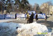 今天莫斯科的气温在零下20摄氏度,连续四个半小时学员们打着中俄文的横幅和真象展板:“法轮大法”;“真善忍”及“至今在中国已有1375名大法学员被迫害致死”;“立即停止在中国迫害法轮功!”学员们在广场的每个街口处向过路人发放真象资料和讲真象,还不断的用扩音喇叭向路人讲清真象,呼吁立即停止在中国迫害法轮功。