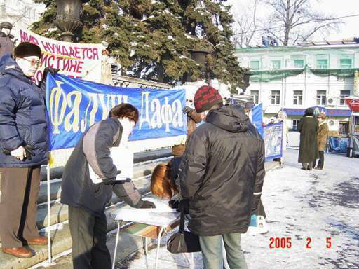 一位中年男士拿到真象资料后,又主动向学员详细了解在中国发生的对法轮功学员的迫害情况,知道真象后问学员“我能帮你们做什么?”,学员告诉他“你可以签名呼吁立即停止迫害”他欣然接受。当他看到有的过路人不愿接下学员递过的真象资料时,他主动的向那位过路人士说:我建议您好好看一看这些资料。请您想想,不制止这种迫害,当这种迫害轮到我们头上时就晚了!他的话深深触动了那些麻木的人。学员们深切感到莫斯科的世人在觉醒。