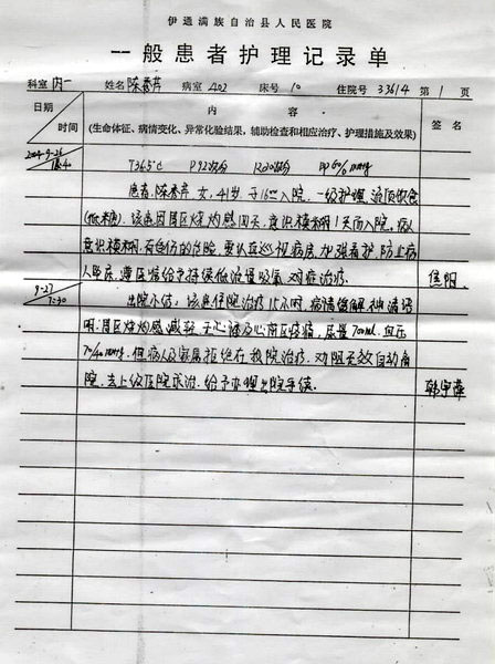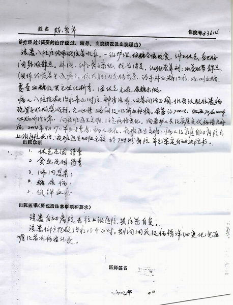 由于身体遭受酷刑折磨,陈秀芹身体出现内烧,拘留的第六天,他们把她拉到医院检查,并给她打了针,吃了药。由于公安局不放人,拘留所又将她拉回并谎说她没病,但他们还一直给她药吃。过后陈秀芹的身体内烧更严重,成宿不关窗户,坐着常把内衣掀起把脊背贴在冰冷的墙上,实在烧的受不了时就把头插在凉水盆里。最后几天烧的她昏昏沉沉,几天起不来床。熬到第十四天,管教看她不行了又把她送入医院,到医院时人已休克。这时国保大队恶警付立军、韩杰等通知其家属速去接人,其家属说:“我家人原先好好的,凭什么给打坏了,送医院去,我们不能接。”可他们邪恶的说:“你们不接人,我们就不管了,爱接不接。”待家属赶到医院时,拘留所恶警赶紧向医院交了500元钱就匆匆逃之夭夭了。