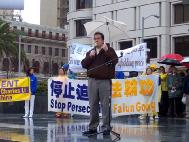 2005年2月27日中午,上千名来自世界各地的法轮功学员在旧金山的联合广场举行“以善面对暴力与仇恨”大集会,希望人们关注发生在中国的迫害,共同制止迫害。